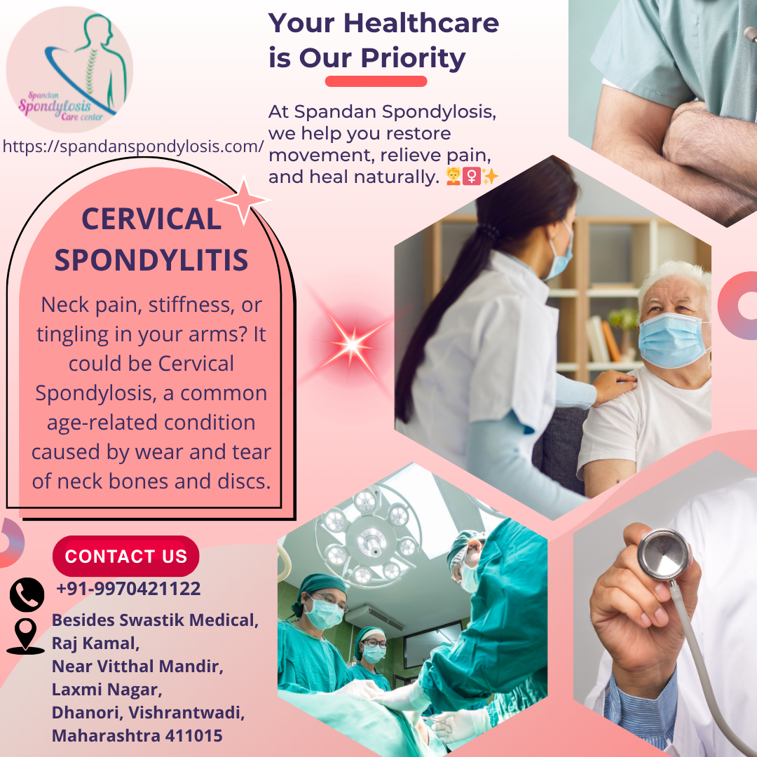 Discover the early warning signs and symptoms of cervical spondylitis. Learn how Spandan Spondylosis Centre in Dhanori helps relieve neck pain, stiffness, and nerve issues naturally. Cervical spondylitis is a common age-related condition that affects the neck’s vertebrae and discs. It can cause pain, stiffness, and nerve compression symptoms that interfere with daily life. At Spandan Spondylosis Centre, Dhanori, we specialize in natural and non-surgical treatments that help patients regain mobility and live pain-free.